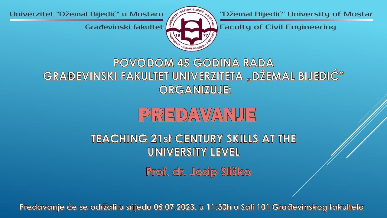 Predavanje će se održati na Građevinskom fakultetu u srijedu 05-07-2023. godine, u Sali 101 sa početkom u 11:30 sati.