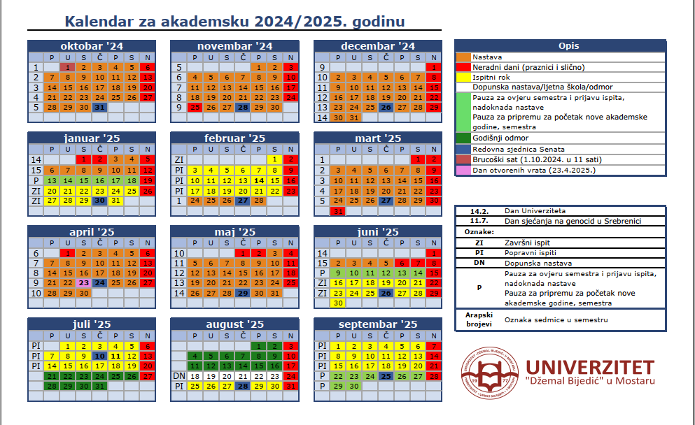 Akademska godina Akademski kalendar Univerziteta “Džemal Bijedić” u Mostaru, ko ...