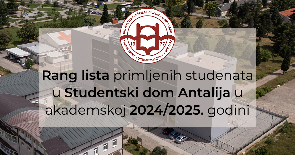 Svi primljeni studenti, koji nisu dostavili, dužni su do 18.10.2024. godine dostaviti potvrdu da su stekli status redovnog studenta u akademskoj 2024/2025. godini, te su dužni potpisati ugovor o korištenju usluga Studentskog doma „Antalija“.
