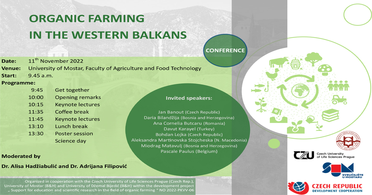 U saradnji sa CULS Češkim Univerzitetom za prirodne nauke iz Praga Fakultetom za tropske agri-nauke, Agromediteranski fakultet Univerziteta "Džemal Bijedić" u Mostaru i Agronomsko-prehrambeno tehnološki fakultet Sveučilišta u Mostaru zajedno organizuju konferenciju "Organic agriculture in Western Balkan".