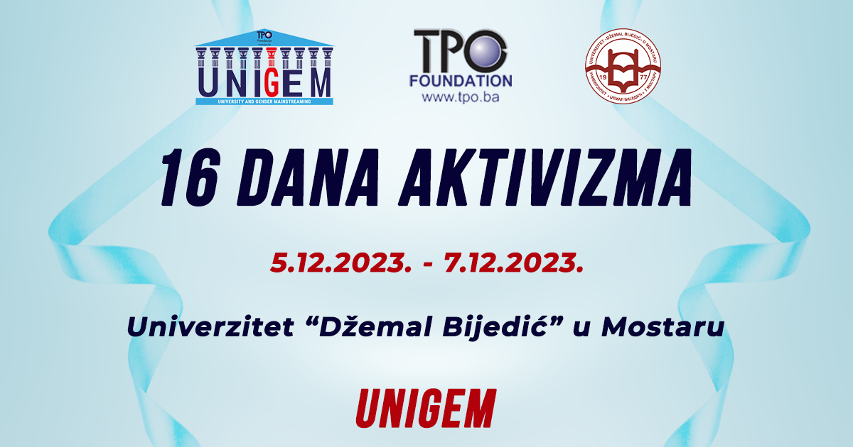 Kampanja pod nazivom „16 dana aktivizma“ koju zajednički implementiraju Univerzitet „Džemal Bijedić“ u Mostaru i TPO Fondacija u okviru projekta UNIGEM, biti će realizovana u periodu od 5. do 7. decembra 2023. godine na Univerzitetu.