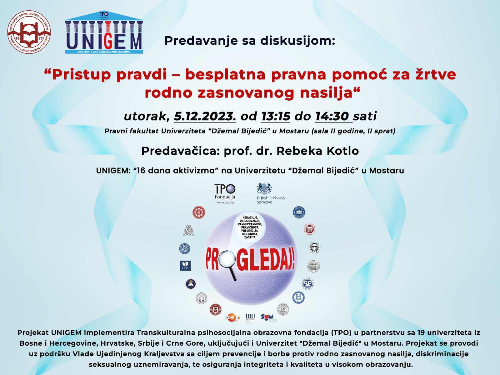 Predavanje sa diskusijom "Pristup pravdi - besplatna pravna pomoć za žrtve rodno zasnovanog nasilja" predstavlja prvi u nizu događaja u okviru kampanje "16 dana aktivizma" koju zajednički provode Univerzitet "Džemal Bijedić" u Mostaru i TPO Fondacija.
