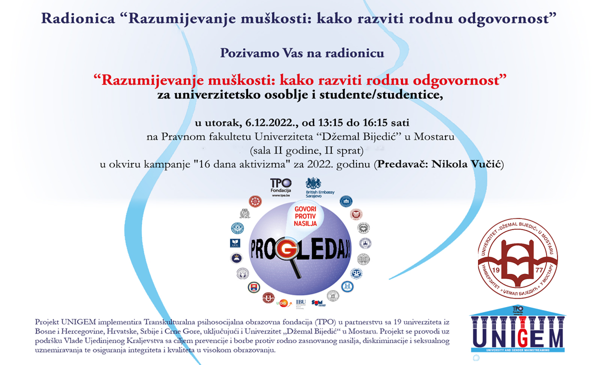 Kampanja pod nazivom „16 dana aktivizma“ u okviru projekta UNIGEM koji provode Univerzitet i TPO Fondacja, će biti održana u periodu od 06. do 09. decembra na Univerzitetu „Džemal Bijedić“ u Mostaru. Tokom trajanja kampanje na Univerzitetu će biti upriličene različite aktivnosti kao što su radionice, diskusije, predavanja i promocije knjiga.