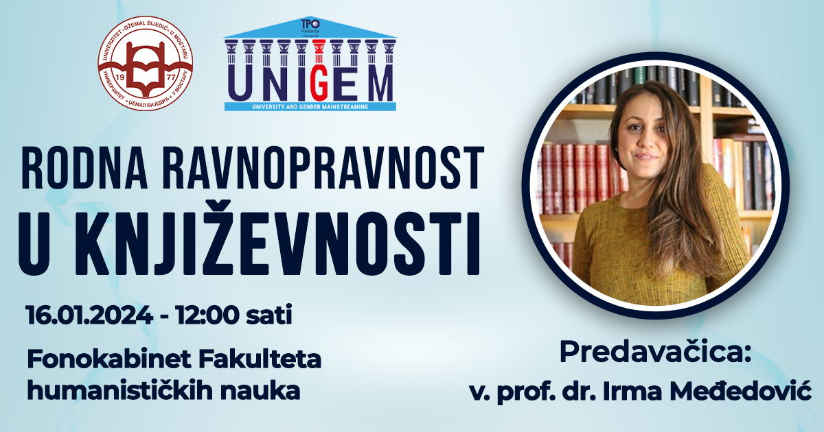 Predavanje sa diskusijom za studentice i studente Univerziteta „Džemal Bijedić“ u Mostaru na temu „Rodna ravnopravnost u književnosti“ će biti upriličeno u utorak, 16. januara 2024. godine sa početkom u 12:00 sati u fonokabinetu Fakulteta humanističkih nauka. Predavanje sa diskusijom će voditi prof. dr. Irma Međedović, vanredna profesorica na Fakultetu humanističkih nauka.