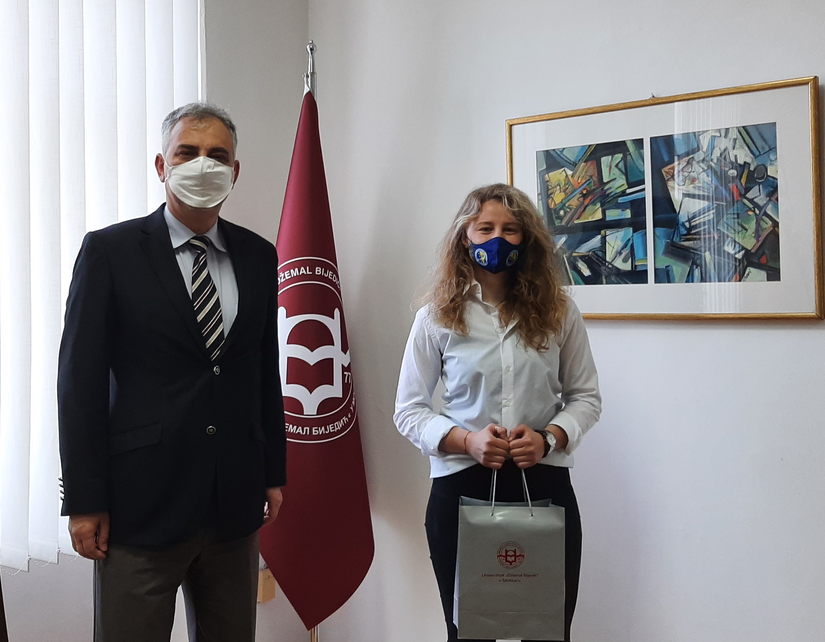 Rektor je danas svečano ugostio reprezentativku ženske rukometne reprezentacije Bosne i Hercegovine, Anisu Selimović, studenticu završne godine Zdravstvene njege na Univerzitetu "Džemal Bijedić" u Mostaru. Anisa iza sebe ima dugogodišnje iskustvo igranja, a trenutno je golmanica rukometnog kluba Hadžići. Reprezentacija se trenutno nalazi u Mostaru na pripremama za predkvalifikacijski turnir koji će se održati u Grčkoj od 4.6.2021-6.6.2021. kao preduslov za odlazak na Euro 2022. Rektor je iskazao podršku reprezentaciji, te poželio uspjeh djevojkama sa željom da se vrate kao pobjednice!