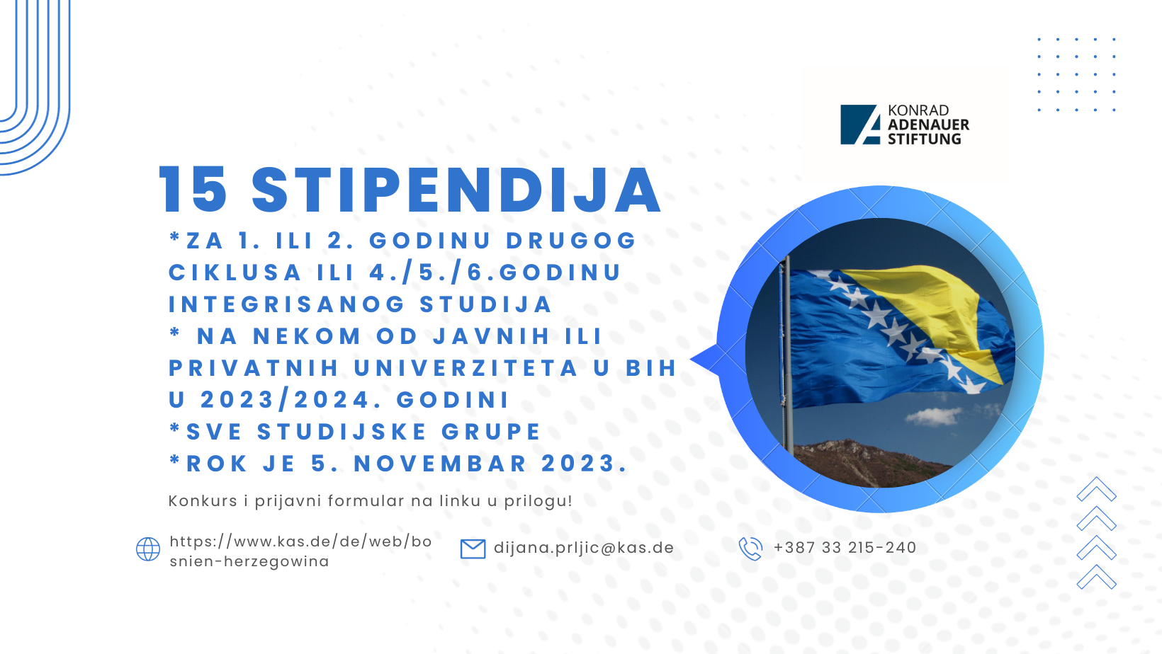 Predstavništvo u Bosni i Hercegovini Fondacije “Konrad Adenauer” raspisalo je konkurs za dodjelu stipendija za studente 1. i 2. godine drugog ciklusa, odnosno od 4. godine naviše integrisanog studija (sve studijske grupe) na nekom od Univerziteta u BiH u akademskoj 2023/24. godini.