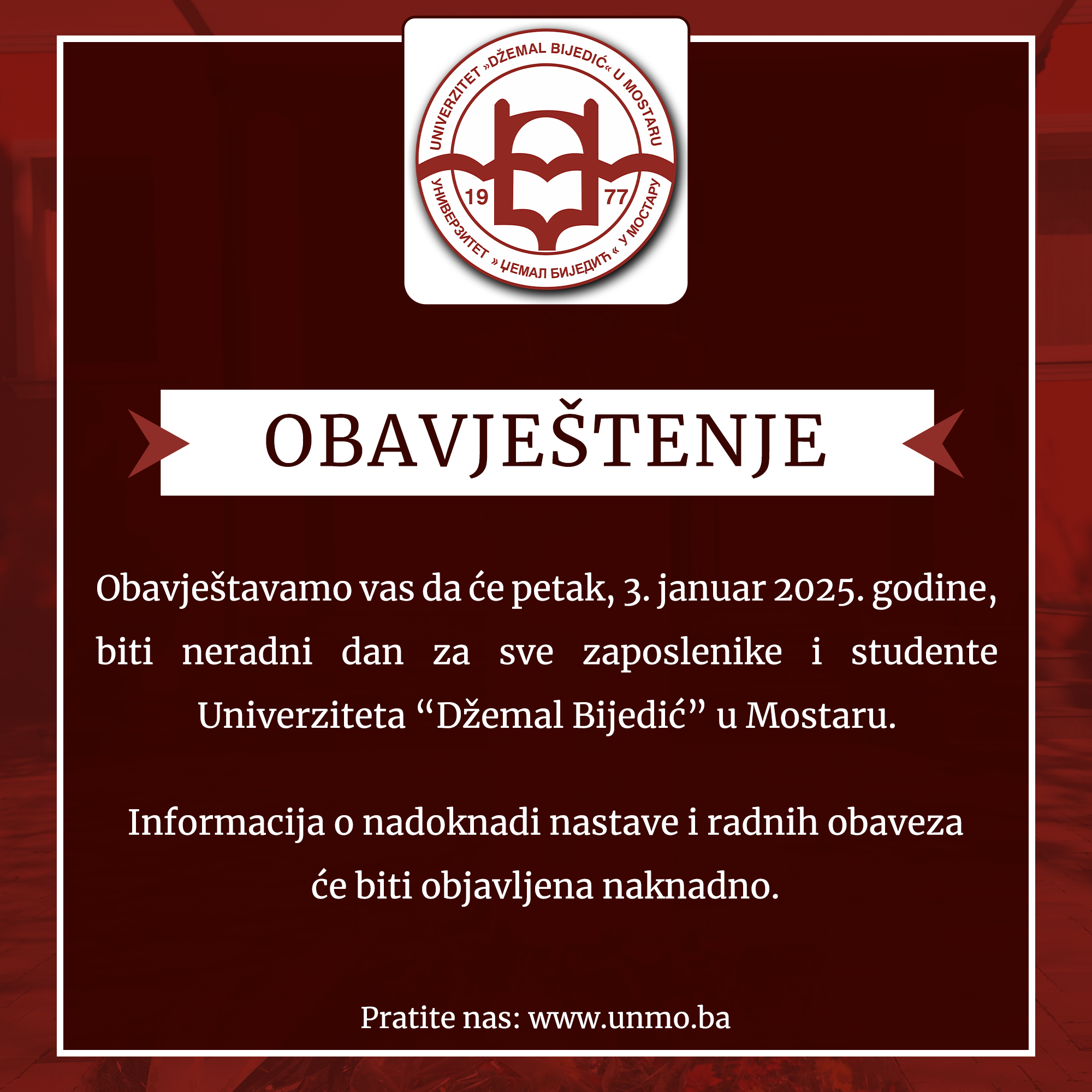 Obavještavamo vas da će petak, 3. januar 2025. godine, biti neradni dan za sve zaposlenike i studente Univerziteta “Džemal Bijedić” u Mostaru.