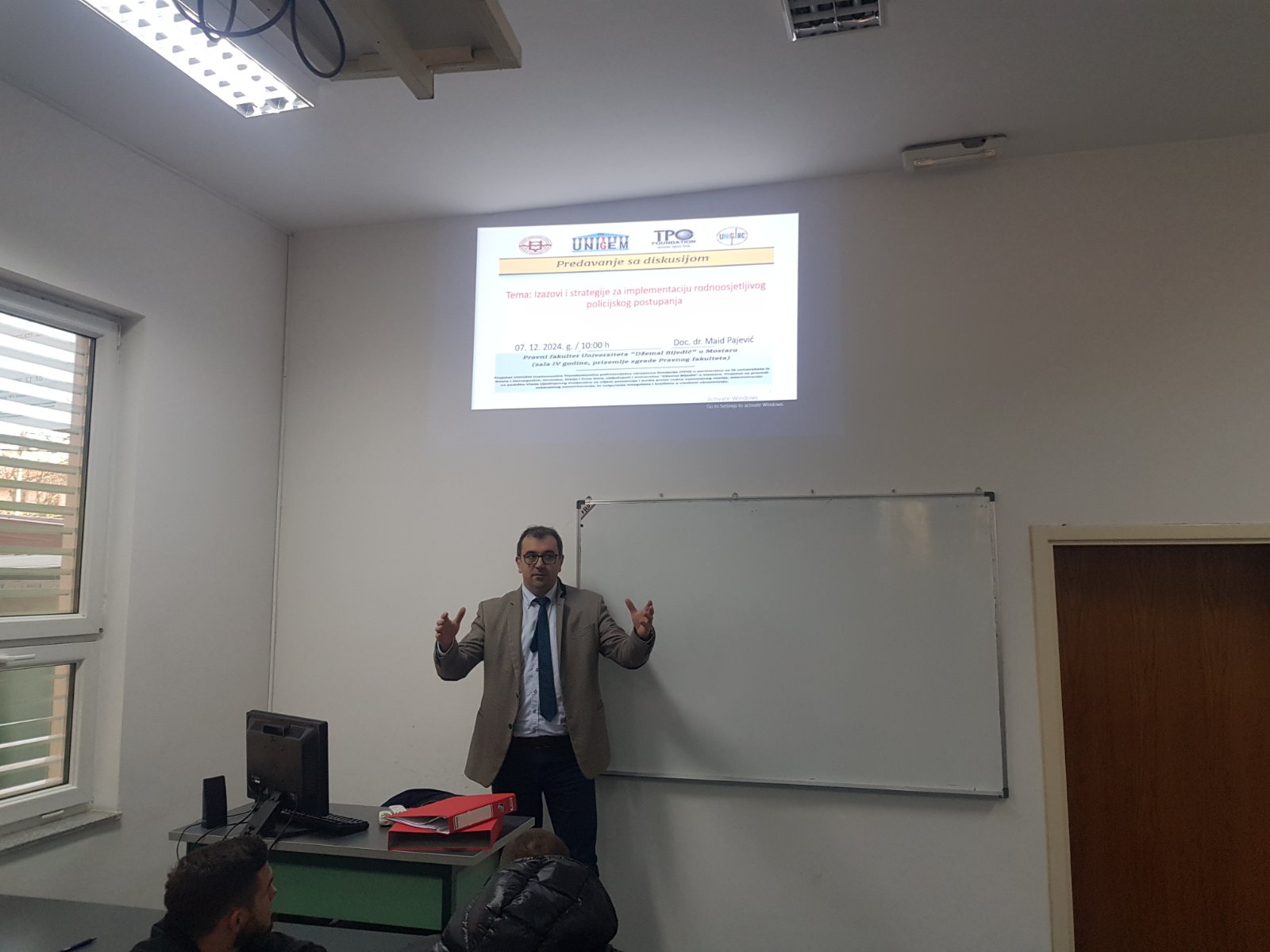 Predavanje na temu ”Izazovi i strategije za implementaciju rodnoosjetljivog policijskog postupanja” uz diskusiju održao je doc. dr. Maid Pajević, za studentice i studente, 7.12.2024. godine (subota) sa početkom u 10:00 sati na Pravnom fakultetu Univerziteta „Džemal Bijedić“ u Mostaru (u sali IV godine, prizemlje zgrade Pravnog fakluteta) s ciljem podizanja i unapređenja znanja i podizanja svijesti o značaju i poštivanju rodne ravnopravnosti.