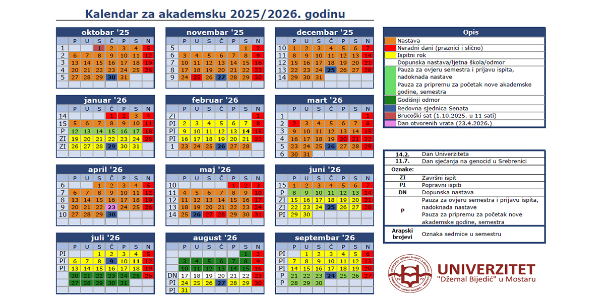 Akademski kalendar za akademsku 2025/2026. godinu i Odluka o usvajanju Kalendara za akademsku 2025/2026. godinu broj: 101 - 3388/25 od 28.8.2025. godine koja je usvojena na 175. sjednici Senata Univerziteta "Džemal Bijedić" u Mostaru održanoj 28.8.2025. godine u prilogu.