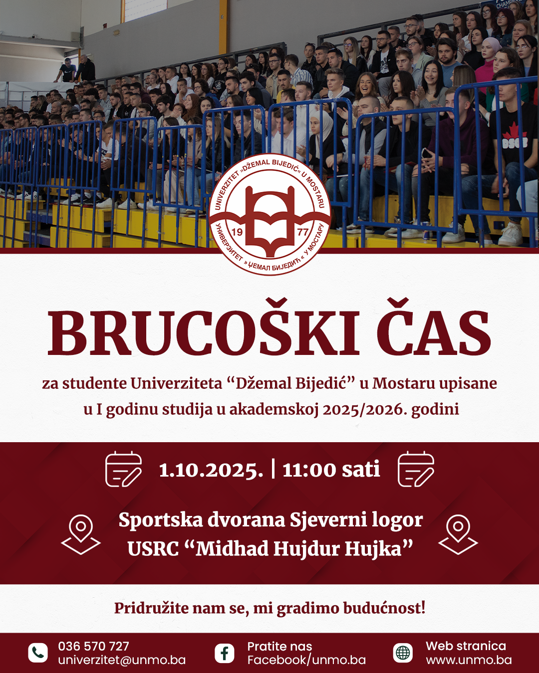 Univerzitet "Džemal Bijedić" u Mostaru obavještava sve studente I godine studija u akademskoj 2025/2026. godini da će se Brucoški čas održati u srijedu, 1. oktobra 2025. godine, s početkom u 11:00 sati. Brucoški čas će biti upriličen u Sportskoj dvorani Sjeverni logor (USRC Midhad Hujdur Hujka).
