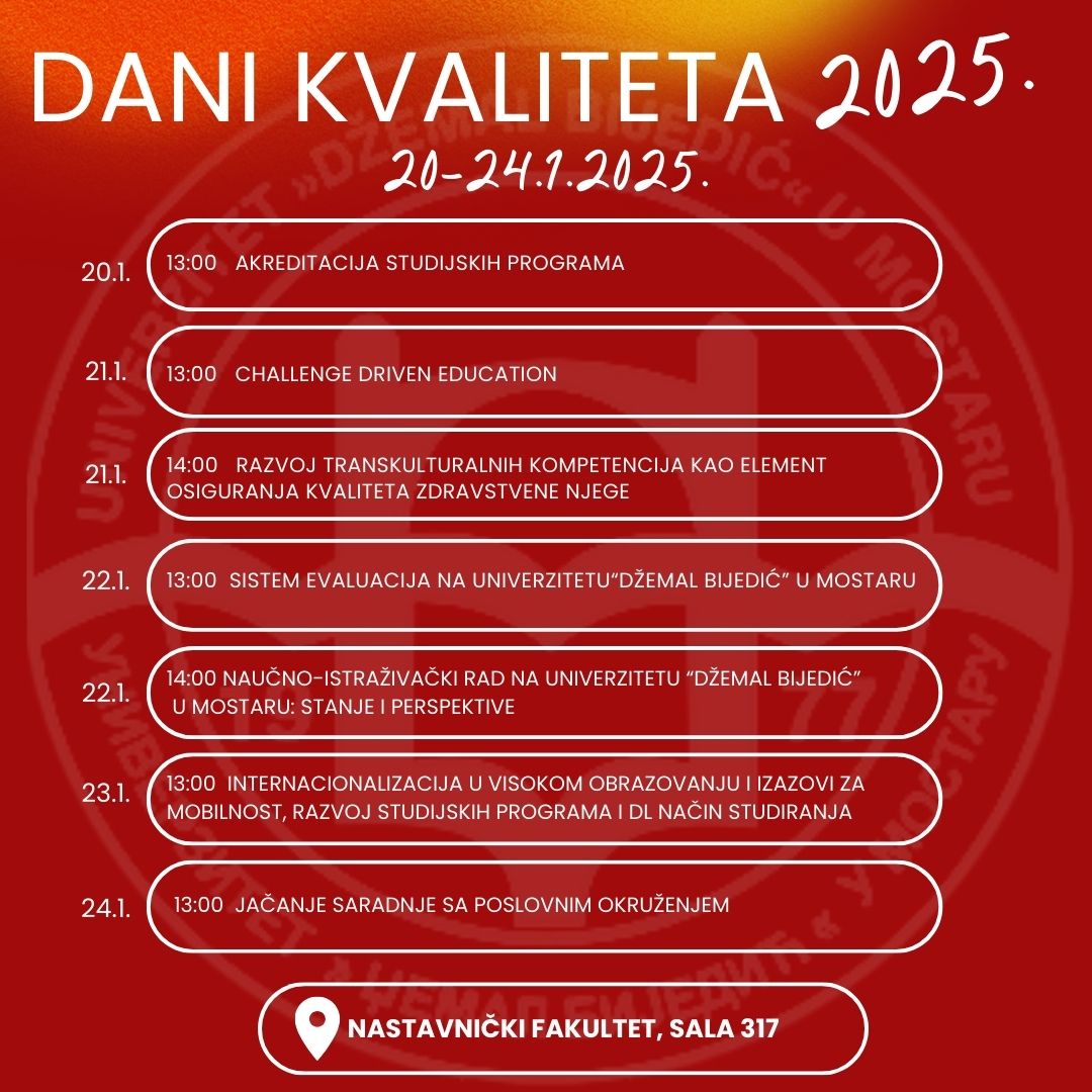 Tradicionalnu aktivnost, već drugu godinu za redom, predstavlja organizacija Dana kvaliteta na Univerzitetu "Džemal Bijedić" u Mostaru, koja predstavlja set različitih radionica i diskusija za uposlenike i studente Univerziteta. Radionice se održavaju s ciljem upoznavanja zaposlenika i studenata Univerziteta sa aktuelnim procesima u obrazovanju, razvoju karijere, jačanju saradnje sa poslovnim okruženjem, razvoju studijskih programa i drugim temama relevantnim za ostvarenje preduslova sistema kvaliteta u visokom obrazovanju.